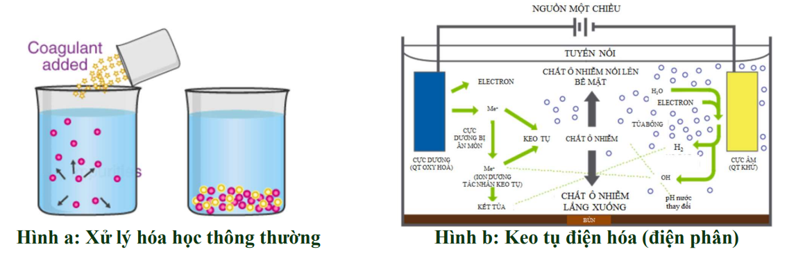 Thiết bị phản ứng điện phân bao gồm bể chứa điện cực chìm (cực dương và cực âm) được nối với nhau tới nguồn điện một chiều. Khi đạt đến điện áp nhất định giữa các điện cực, dòng điện một chiều sẽ ăn mòn điện cực dương (anode) bằng kim loại (thường là nhôm hoặc sắt) để giải phóng các ion Al hoặc ion Fe vào dung dịch. Các ion này tạo ra khối keo tụ ổn định cho phép loại bỏ cơ học các chất gây ô nhiễm bằng: Tuyển nổi khí, lắng trọng lực hoặc lọc cơ học.