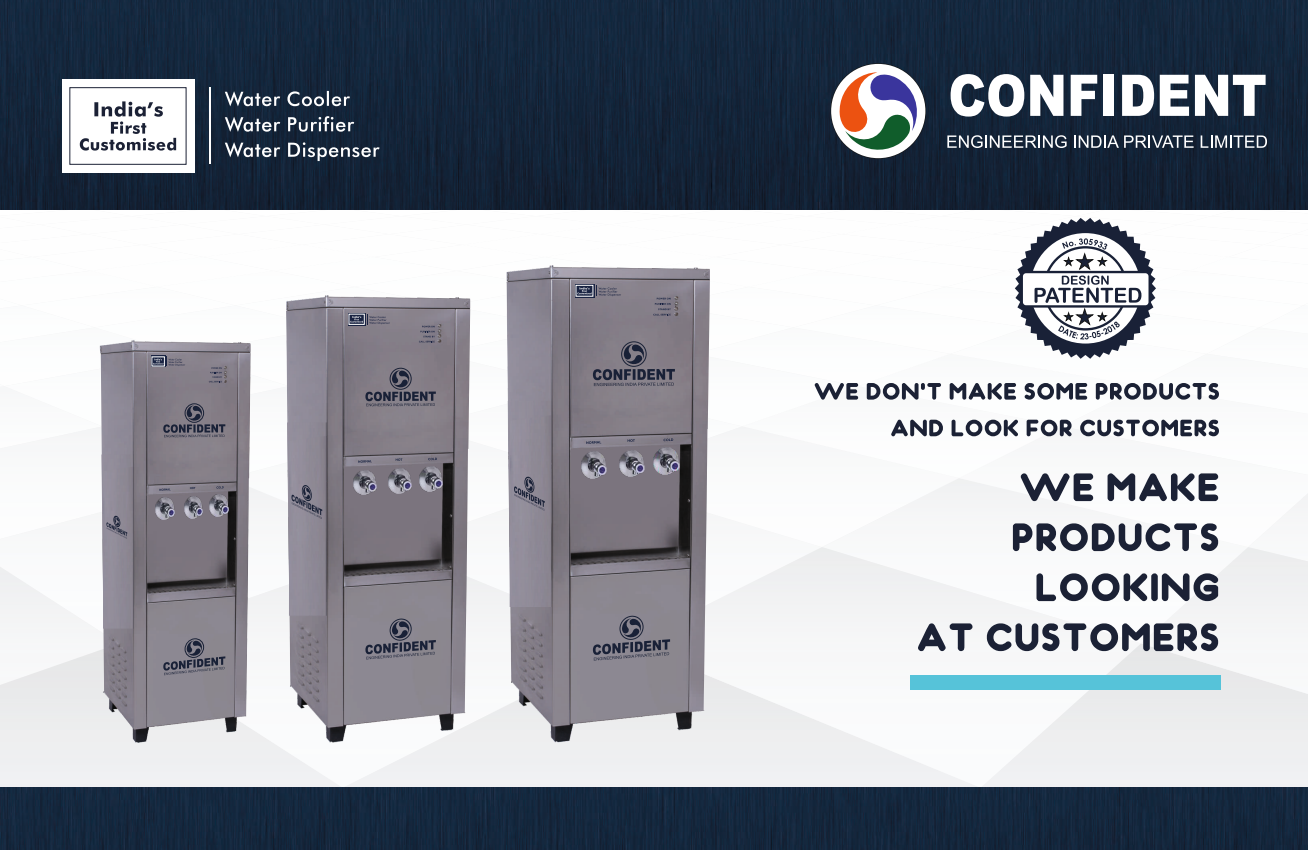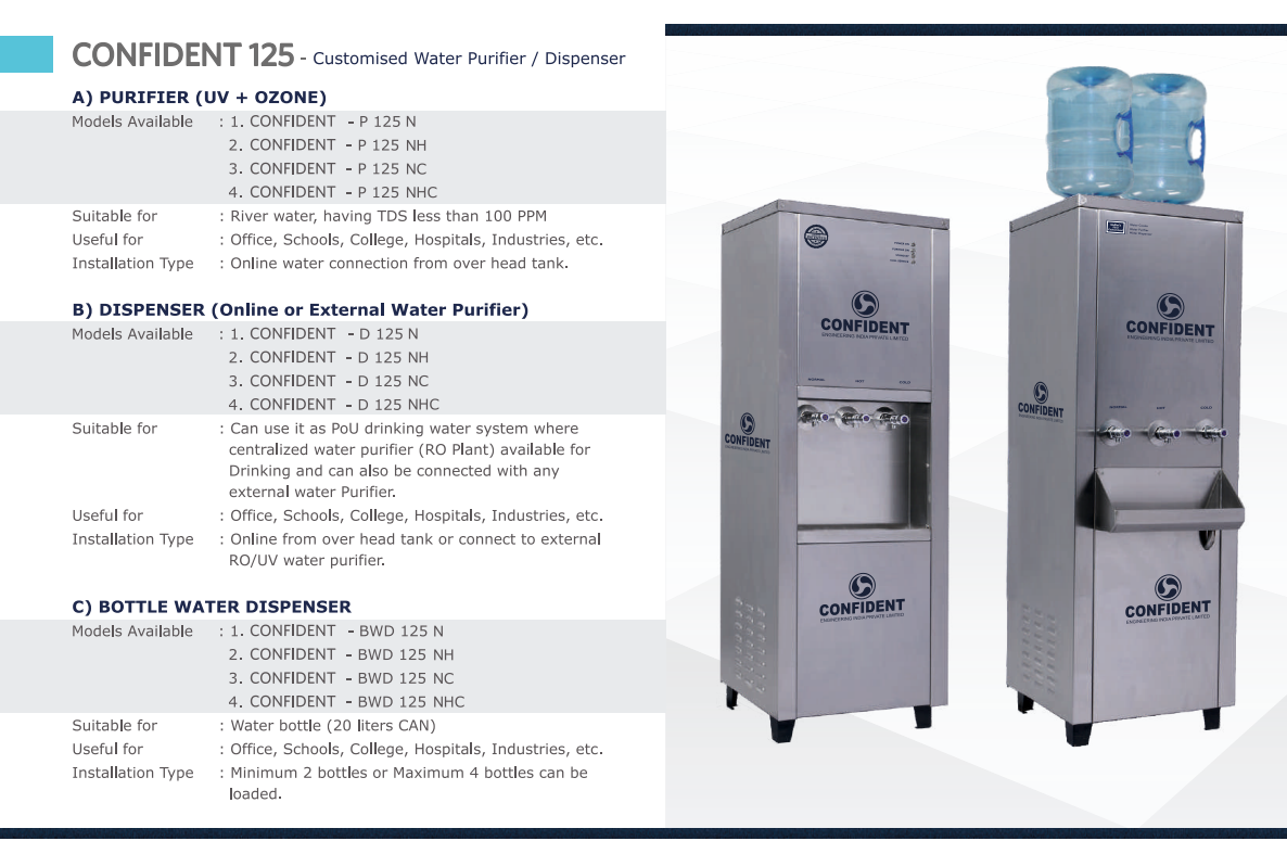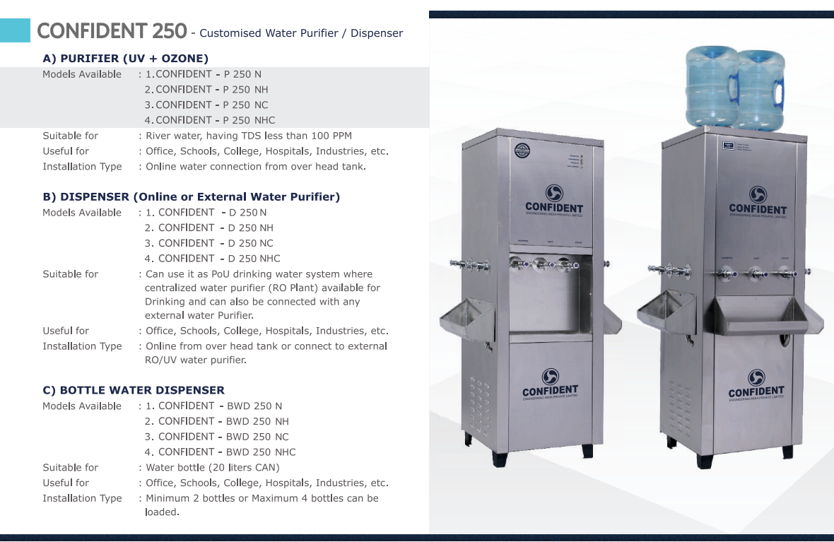 CONFIDENT customized water purifiers are available from 50 LPH to 250 LPH and absolutely customisable as per customer's need: