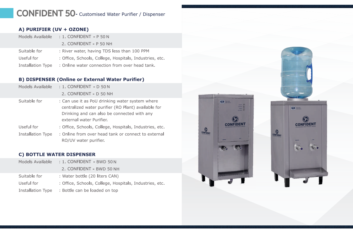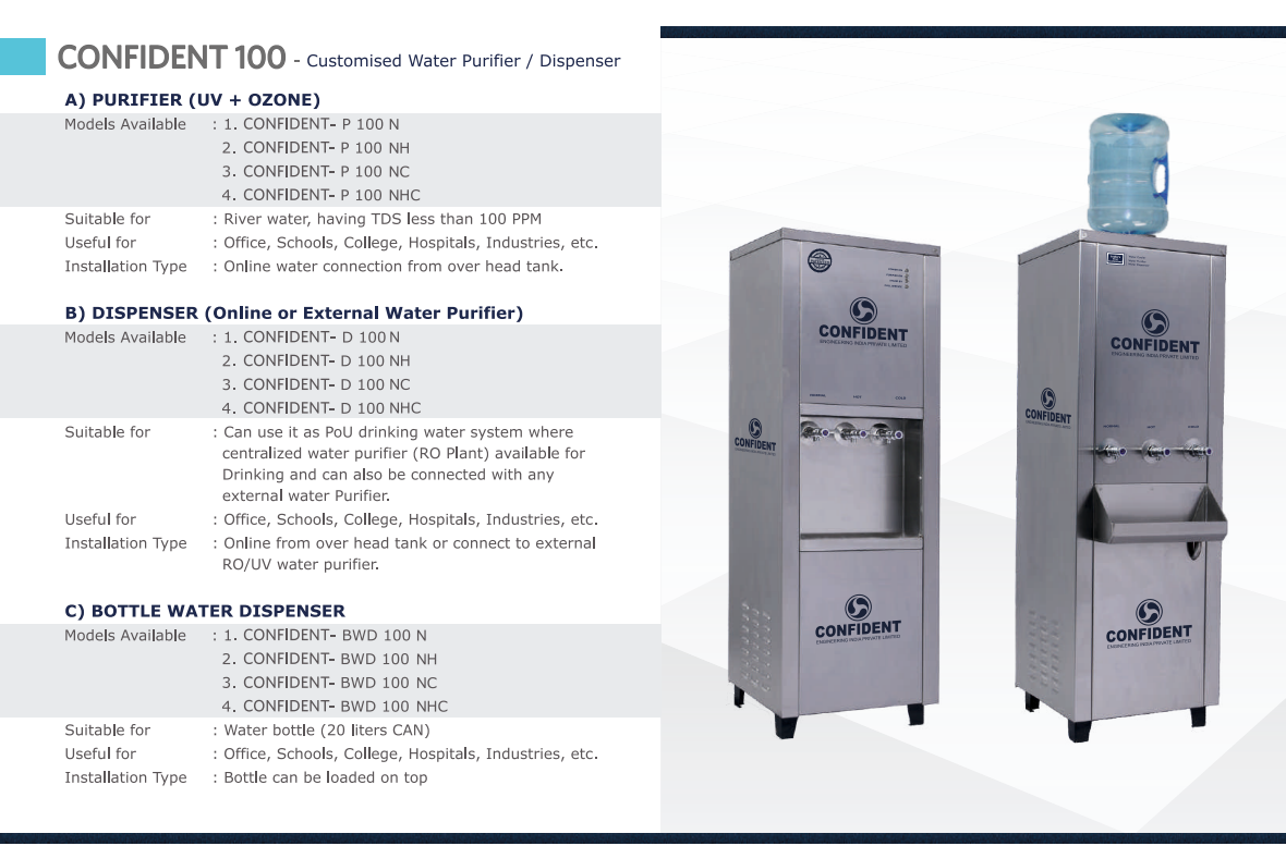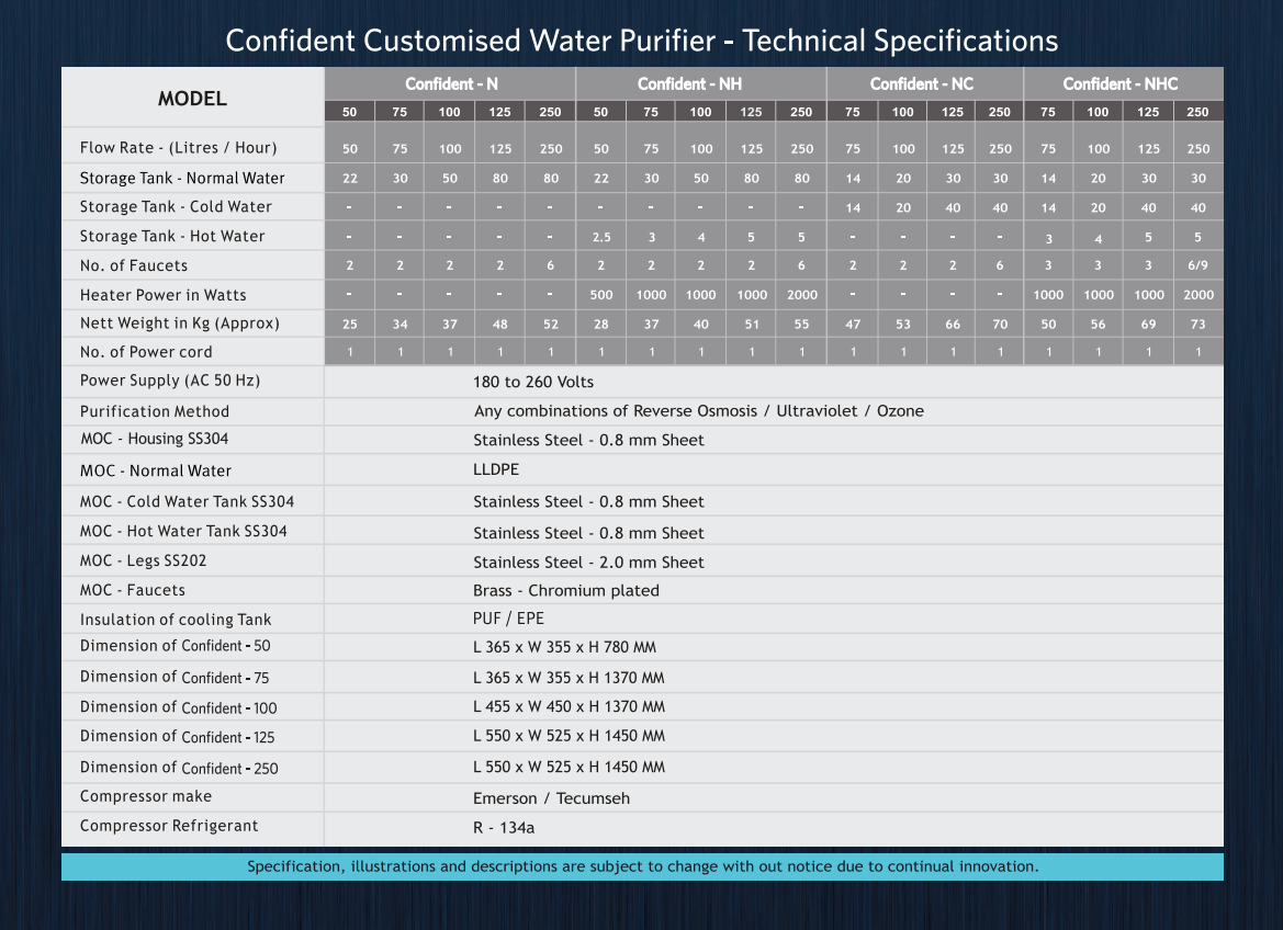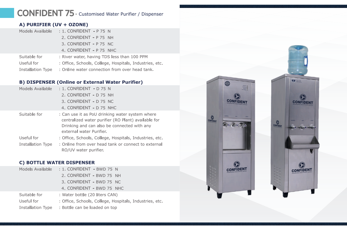 CONFIDENT customized water purifiers are available from 50 LPH to 250 LPH and absolutely customisable as per customer's need: