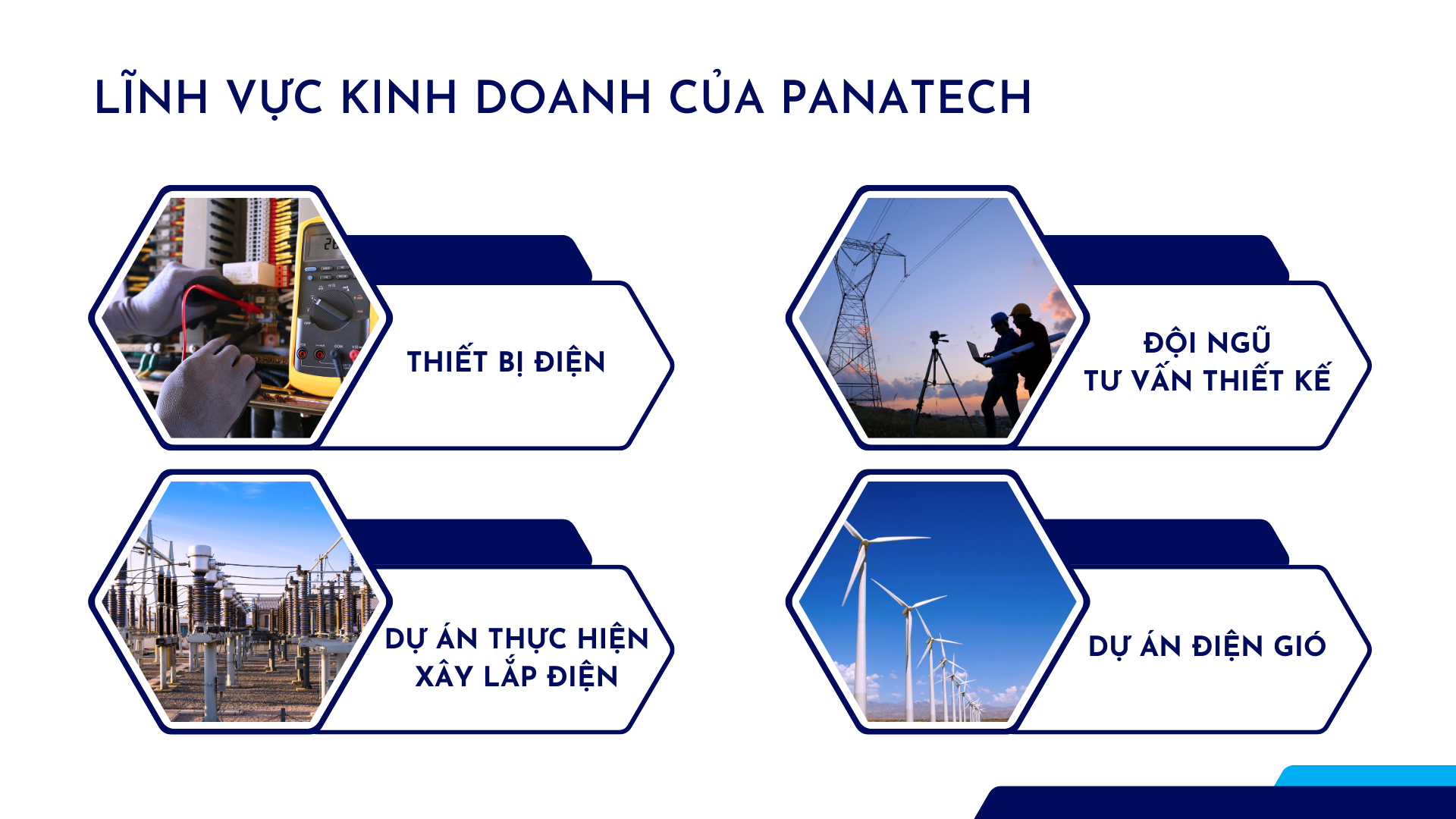 Công ty PANATECH đã và đang khẳng định vị thế trên thị trường miền nam và hướng tới thị trường cả nước thông qua những hoạt động kinh doanh chủ lực như: Tư vấn, thi công xây lắp các công trình đường dây và trạm biến áp đến 220kV; cung cấp lắp đặt các công trình năng lượng, thi công hệ thống cơ điện.