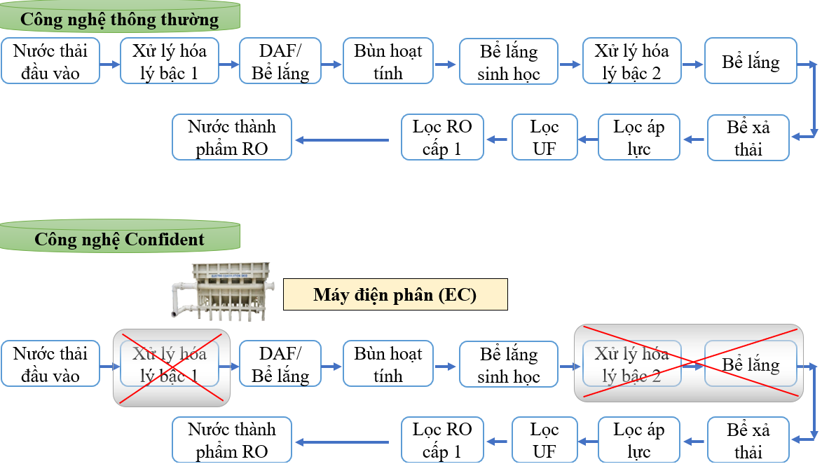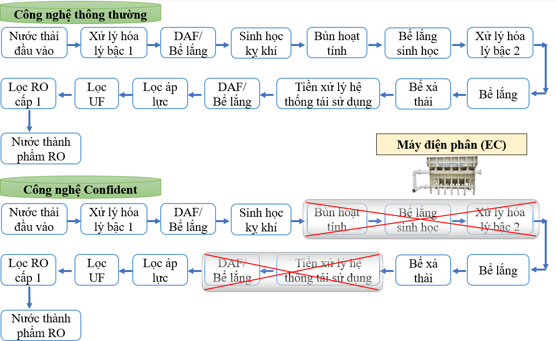 Với mong muốn đem lại sự tăng trưởng và phát triển bền vững, Confident đã ứng dụng thành công và được cấp bằng sáng chế ở Hoa Kỳ về quy trình tái sử dụng nước thải ứng dụng công nghệ điện phân cải tiến và được bảo hộ quốc tế. Quy trình tái sử dụng của chúng tôi có các ưu điểm như: