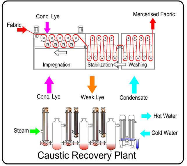 Trong các nhà máy làm bóng, vải thô được xử lý bằng dung dịch kiềm hay xút vảy (caustic soda). Trong quá trình này, chất lỏng yếu (nồng độ thấp) được thải ra với nồng độ 5% (50000 ppm dung dịch kiềm). Dung dịch kiềm này có thể được thu hồi với sự trợ giúp của hệ thống thu hồi Caustic Soda bao gồm nhiều thiết bị bay hơi. Trong thiết bị bay hơi, rượu yếu được cô đặc đến 26% và được tái sử dụng trong thiết bị kiềm hóa.